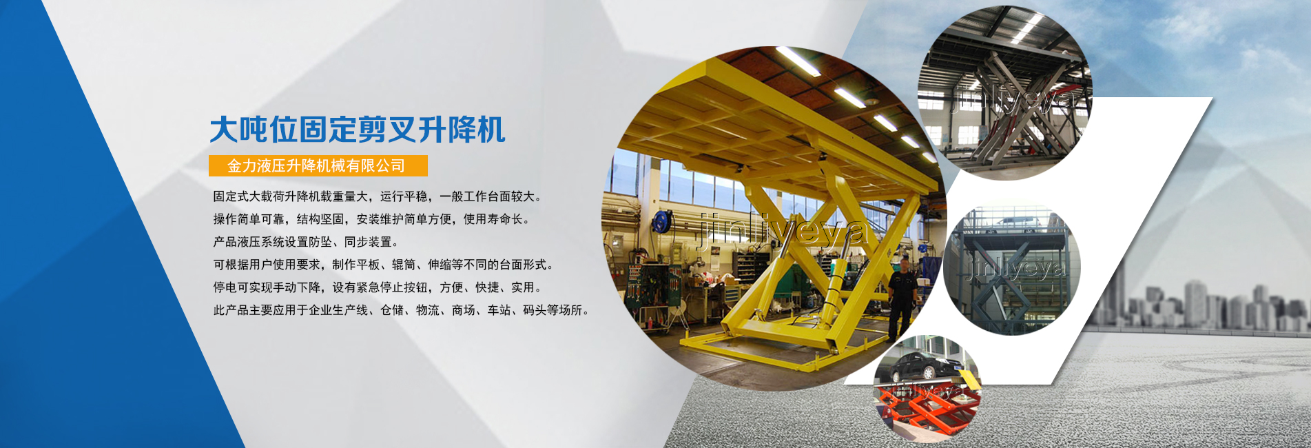 金力公司主要致力于液壓升降機(jī)械的研發(fā),主導(dǎo)產(chǎn)品有高空作業(yè)平臺(tái)、液壓升降機(jī)、升降平臺(tái)、登車(chē)橋等十幾個(gè)系列。...