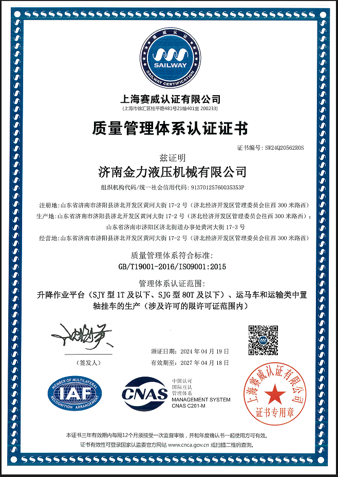 總之,9001質(zhì)量認(rèn)證證書的獲得是對(duì)濟(jì)南金力液壓機(jī)械有限公司過去工作的肯定,也是對(duì)未來發(fā)展的信心。希望公司能夠在這個(gè)基礎(chǔ)上不斷提升自身的管理水平和產(chǎn)品質(zhì)量,為客戶提供更的產(chǎn)品和服務(wù)。